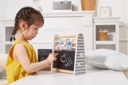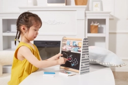 Súčasťou je malá tabuľa a bezprašná krieda na písanie číslic, prvých príkladov aj vlastných obrázkov – ideálne na rozvoj kreativity.