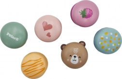 Sada obsahuje šesť makróniek v rôznych farbách a s hravými motívmi (srdiečka, ovocie, zvieratká), ktoré podnecujú fantáziu a tematickú hru.