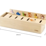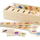 Drevený sorter VIGA je premyslená vzdelávacia pomôcka v montessori štýle. Na hornú stranu boxu sa umiestni jedna z dlhých dosiek s motívmi a dieťa vkladá drevené dieliky do správnych otvorov podľa obrázkov a kategórií. Hra rozvíja vizuálne vnímanie, jemnú motoriku a sústredenie, zároveň učí deti rozpoznávať ovocie, zeleninu, zvieratá, tvary, dopravu aj čísla.