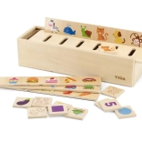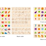 Deti vkladajú drevené dieliky do správnych otvorov podľa obrázkov na doske. Cvičia logiku, pozornosť a jemnú motoriku pri každej hre.
