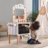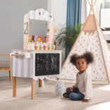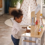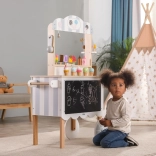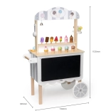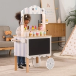 Tento drevený stánkový set funguje ako predajňa, cukráreň alebo zmrzlinový stánok. Svoj obľúbený scenár si môžu deti zahrať vďaka mnohým príslušenstvám akými sú lízanky, zmrzliny, oblátky a polevy. Skvelou súčasťou je tabuľa na písanie či kreslenie dnešného menu. Celý set je natretý netoxickými farbami v jemných farbách, ktoré priťahujú detskú pozornosť.
