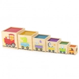 Tento úžasný set obsahuje šesť kociek rôznych veľkostí, z ktorých každá má svoje špecifické motívy. Deti sa tak učia rozoznávať čísla, tvary, farby, veľkosti a zvieratá. Kocky je možné ľahko umiestňovať jednu do druhej alebo ich skladať na seba, čo pomáha deťom pochopiť koncept usporiadania a poradia.