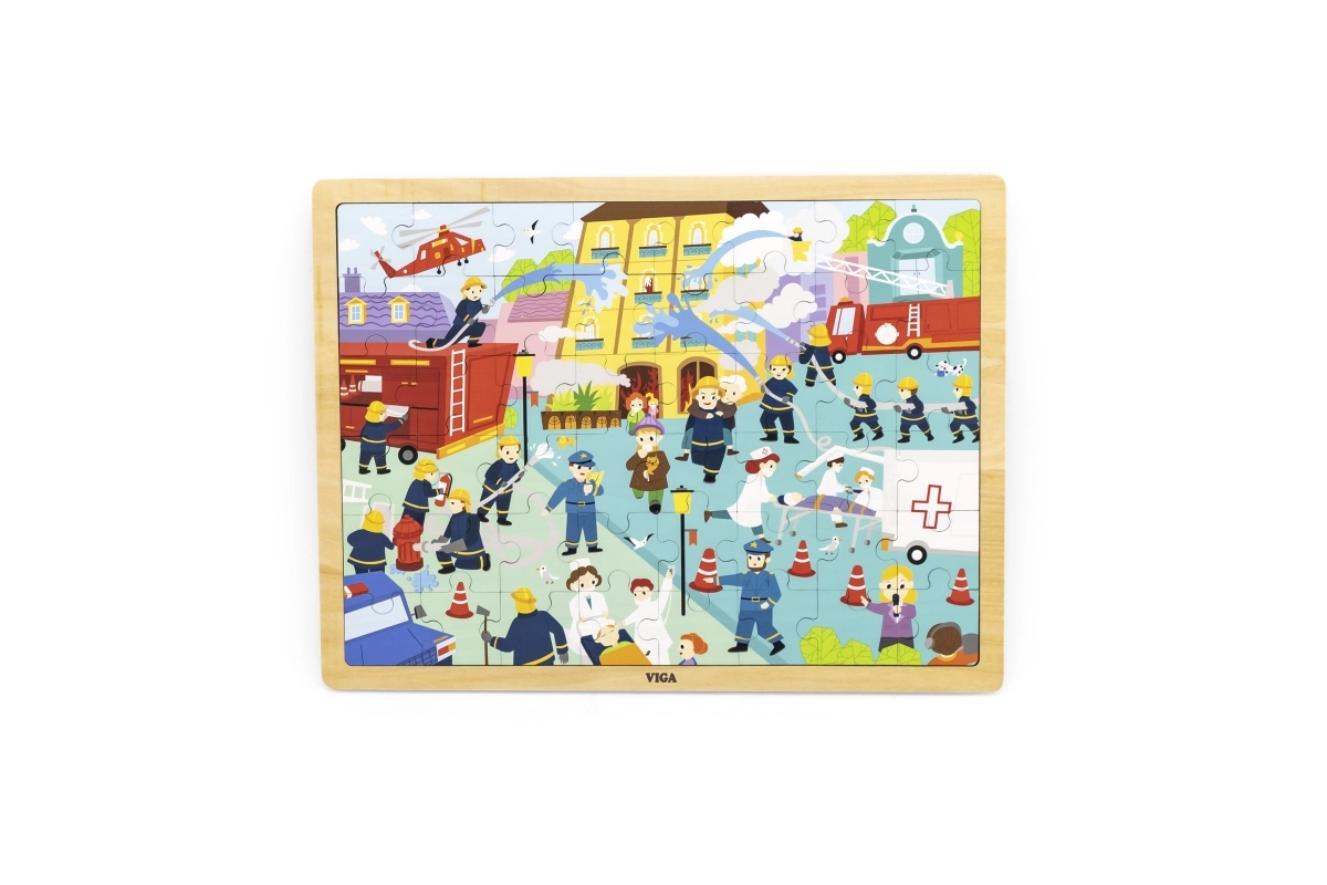 Toto kvalitné drevené puzzle s farebným obrázkom hasičov je skvelé na prvé skladanie aj rozvoj zručností predškolákov. Dieliky sú pevné, príjemné do ruky a skladajú sa do stabilnej drevenej podložky, ktorá uľahčuje manipuláciu aj ukladanie.