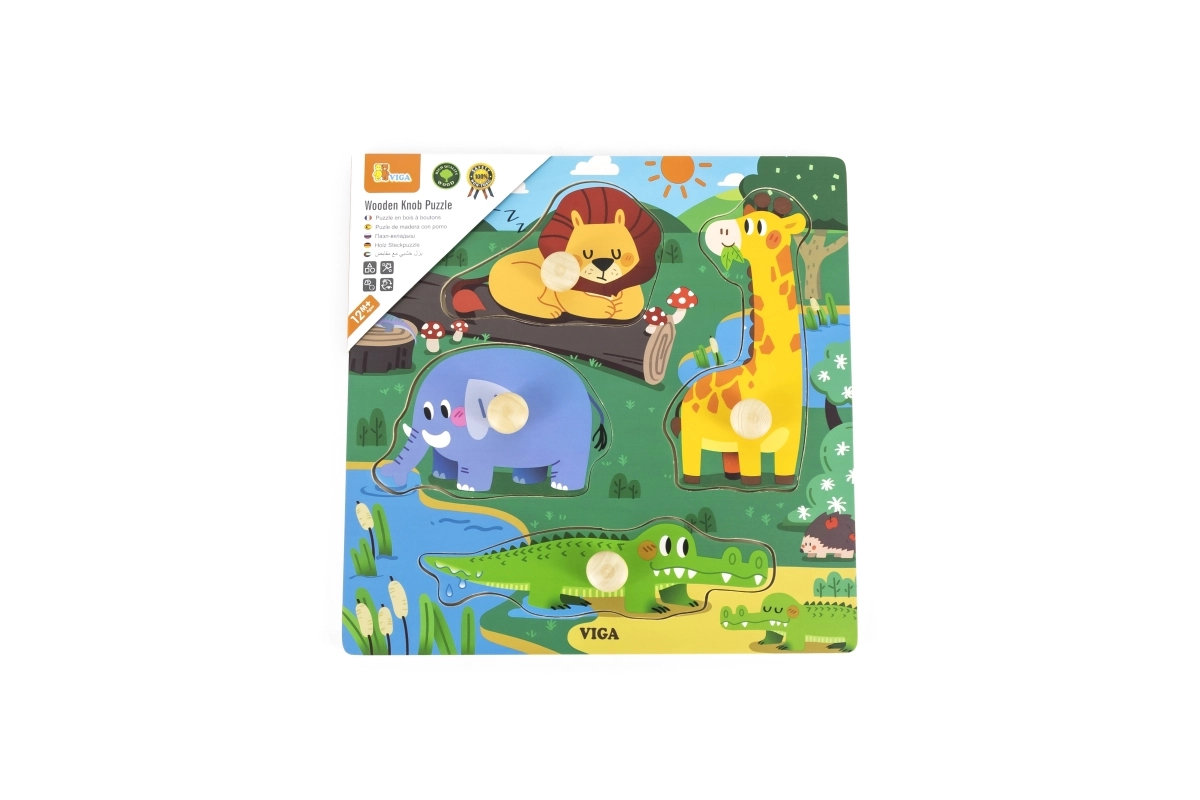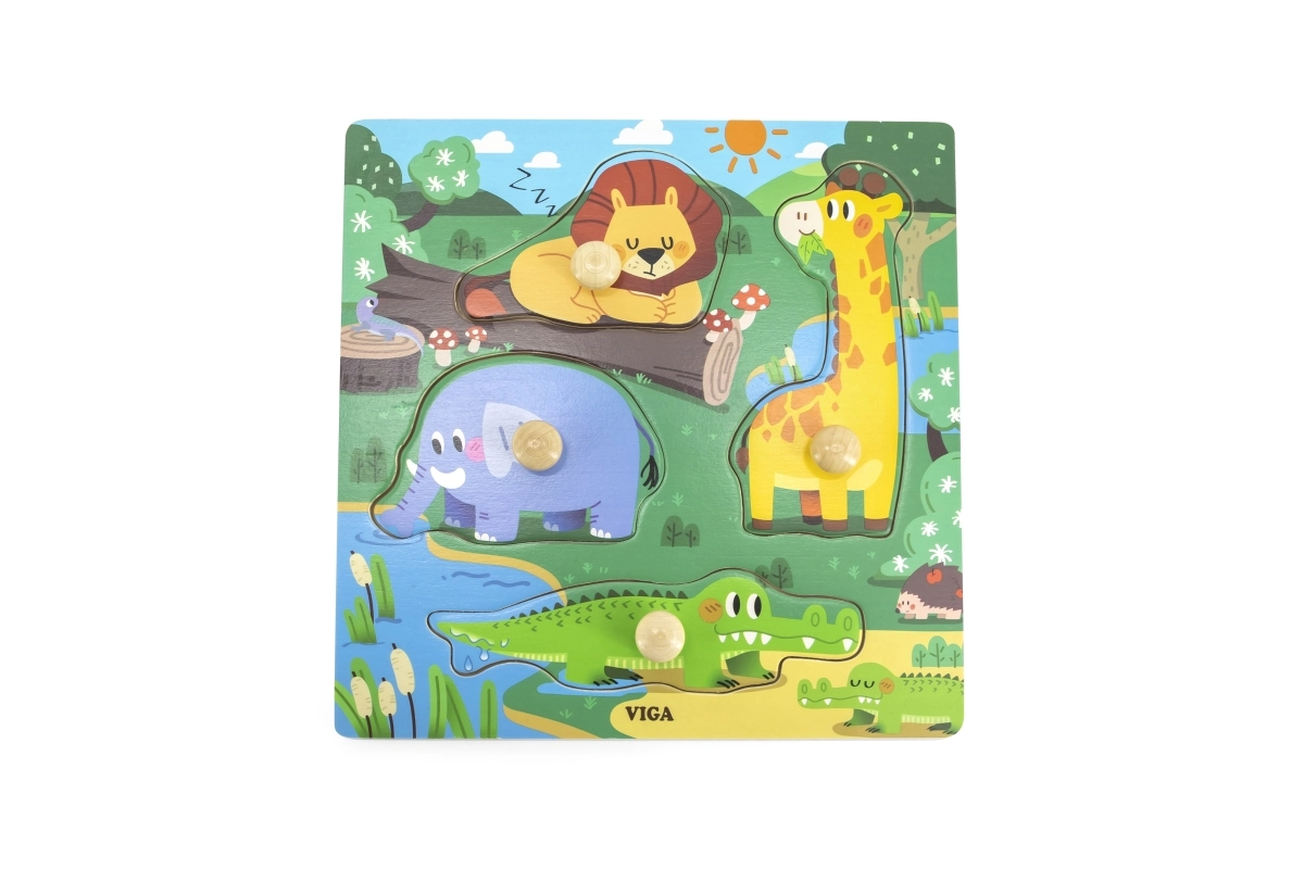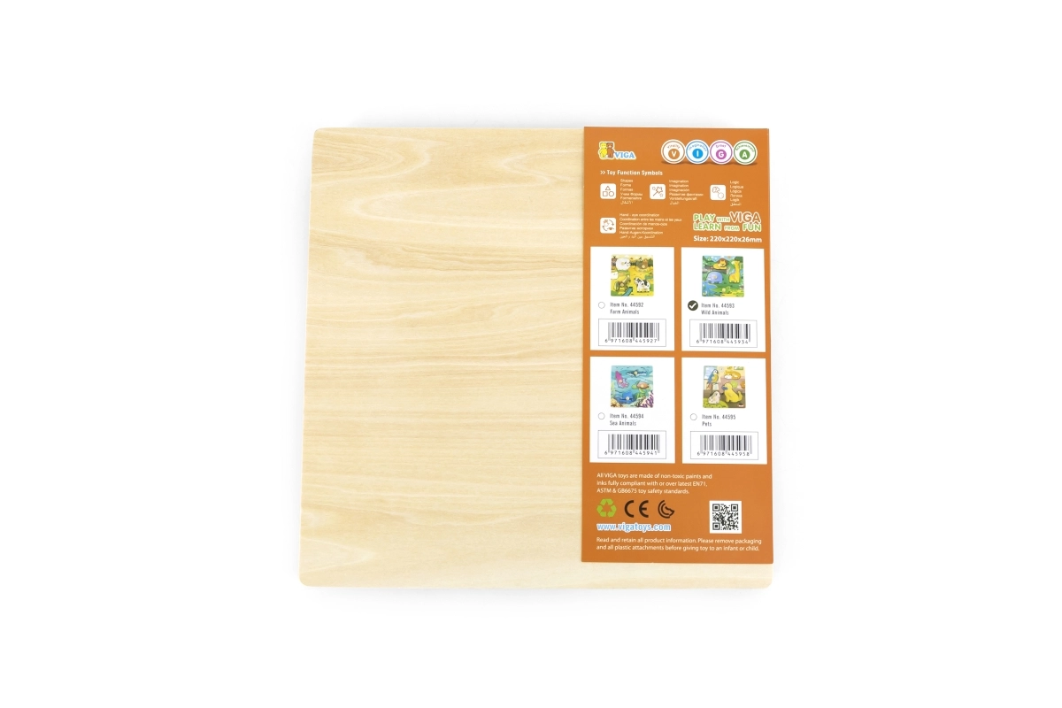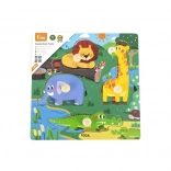 Drevená vkladačka s divokými zvieratkami. Rozmery drevenej dosky cca 22,5 x 22,5 cm. Rozmery balenia cca 22,5 x 25,5 x 1 cm. Vek 12m+