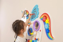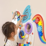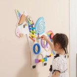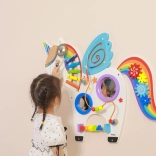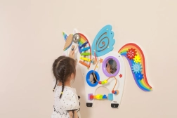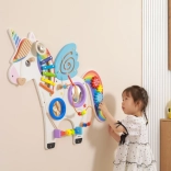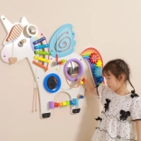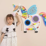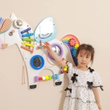 Táto multifunkčná nástenná tabuľa v podobe jednorožca kombinuje hudobné, hmatové aj logické prvky do jedného atraktívneho celku. Deti si zahrajú na xylofón, pretočia ozubené kolieska, vyskúšajú magnetický labyrint aj zrkadielka a precvičia si farby, tvary a koordináciu pohybov.