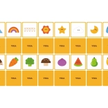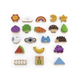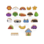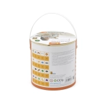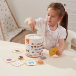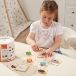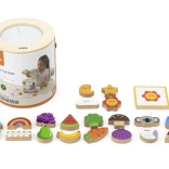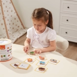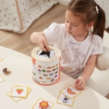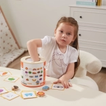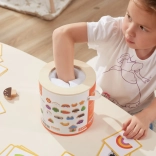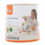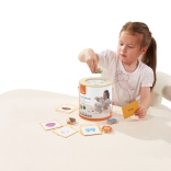 Hra Chyť a nájdi. Balenie obsahuje 20 kociek, papierové vedierko, 20 herných kariet a veko. Rozmery balenia cca 16 × 15,5 cm. Vek 3+