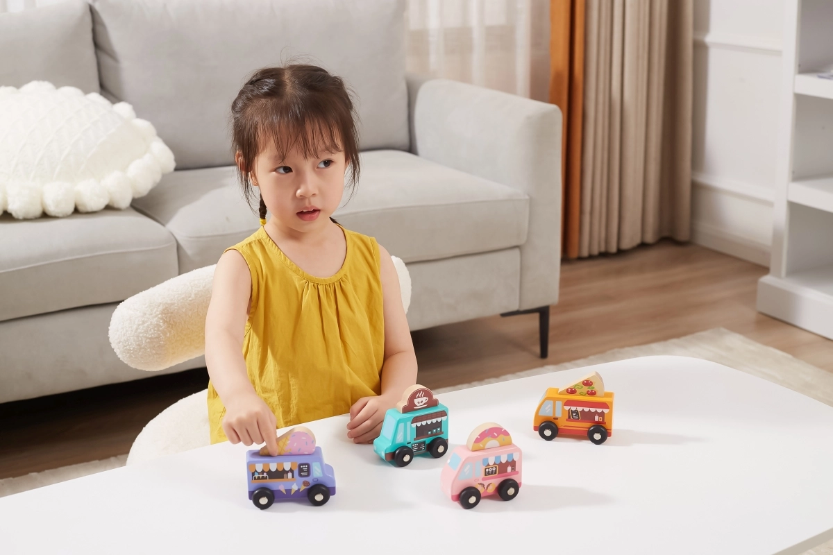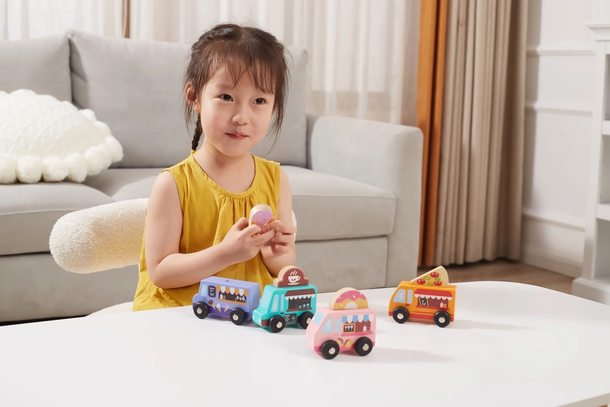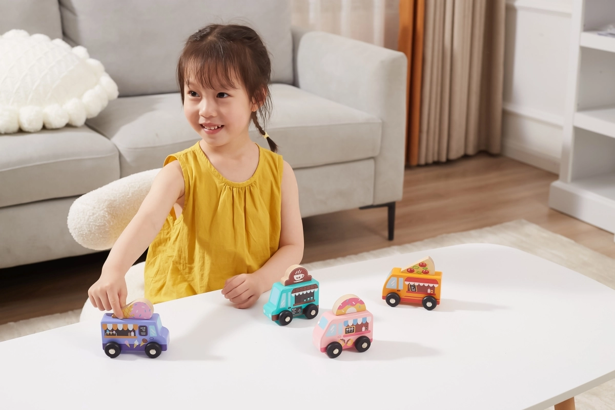Horné cedule s motívmi pizze, kávy, zmrzliny a donutov možno ľahko prehadzovať. Deti si tak zostavia vlastný food truck podľa fantázie a rozvíjajú role-play.