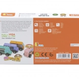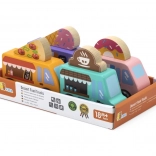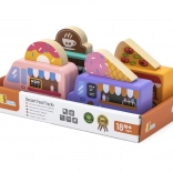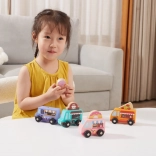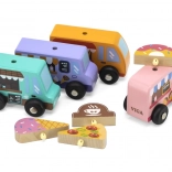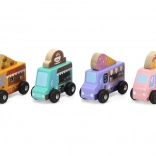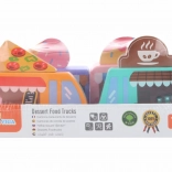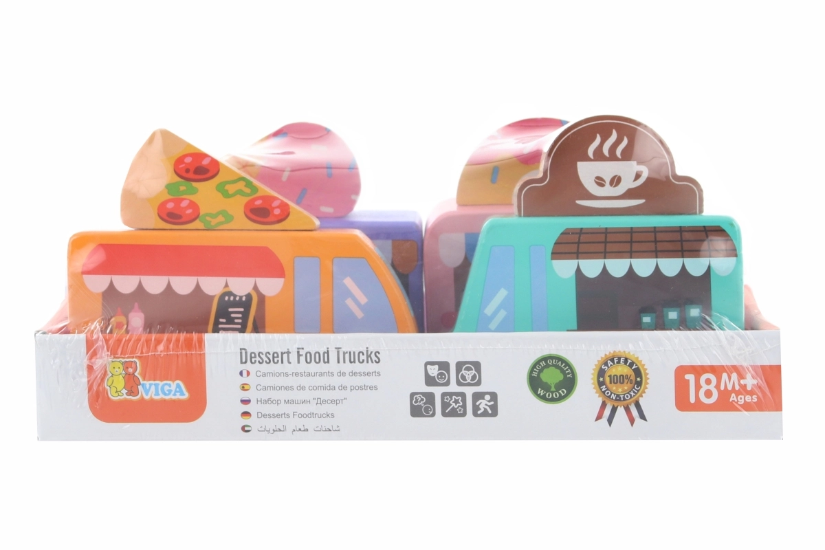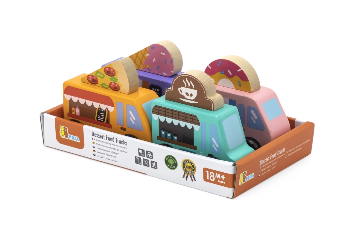 Drevená sada food truckov Viga prináša štyri roztomilé vozidlá na kolieskach v pastelových farbách s detailnými potlačami. Každý truck má tematický banner – pizza, káva, zmrzlina a donuty – ktorý možno ľubovoľne prehadzovať, takže deti môžu tvoriť vlastné príbehy a prevádzky. Kvalitné drevo a netoxické farby zaistia bezpečnú a dlhotrvajúcu zábavu.