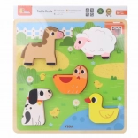 Táto roztomilá drevená skladačka s témou farmy obsahuje 5 robustných dielikov – koníka, ovečku, sliepočku, psíka a káčatko. Deti vkladajú zvieratká do zodpovedajúcich otvorov na farebnej podložke, čím si trénujú rozpoznávanie tvarov a vizuálnu pamäť.