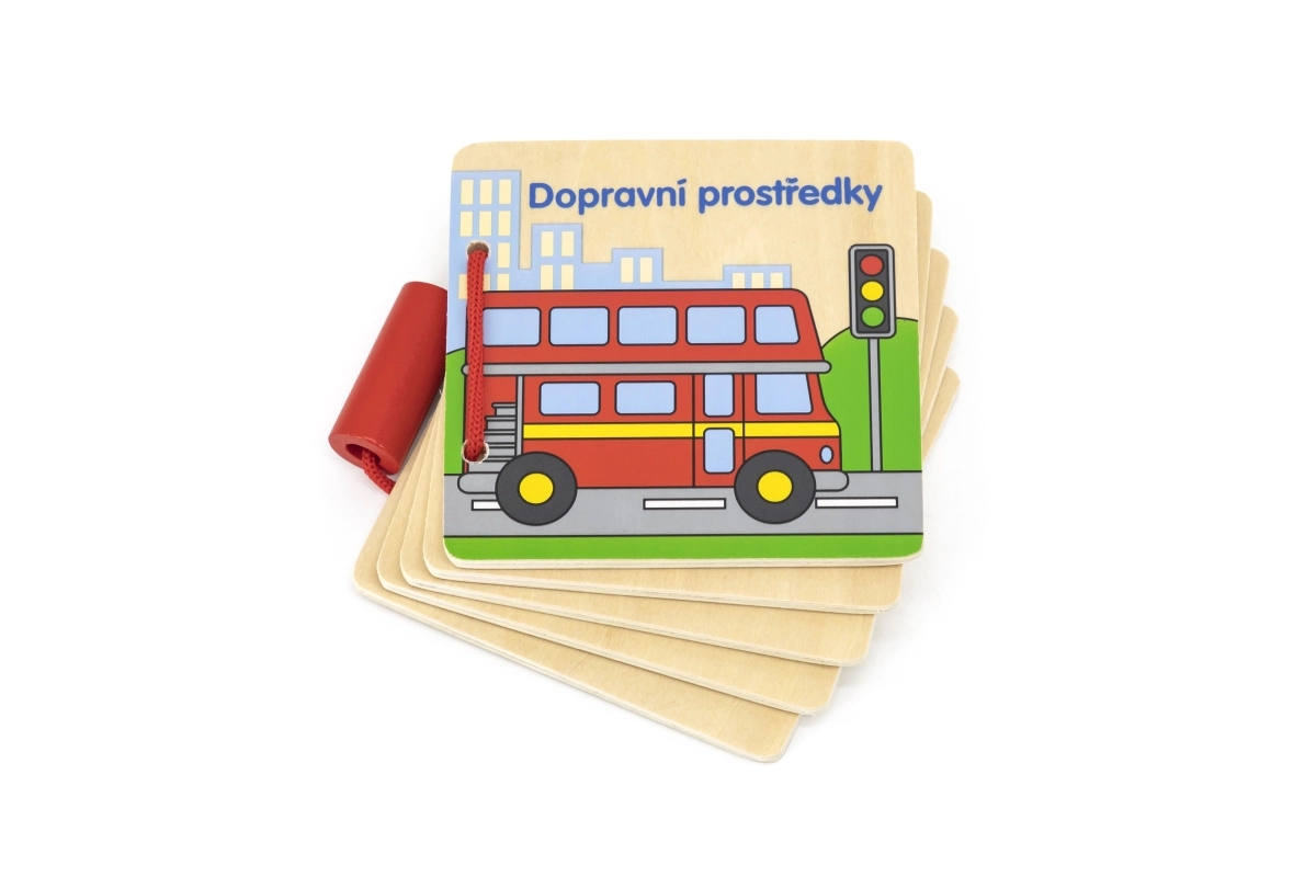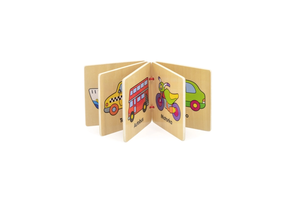 Objavte prvé čítanie pre najmenších: drevená knižka s obrázkami a názvami dopravných prostriedkov v českom jazyku. Odolné drevené listy, ľahké otáčanie a bezpečné prevedenie pre deti od 12 mesiacov podporia rozvoj slovnej zásoby aj jemnej motoriky.