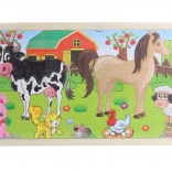 Drevené puzzle Na farme pozostáva z 96 dielikov, ktoré sú umiestnené na pevnej drevenej doske s okrajom, slúžiacom ako podložka na skladanie. Pod doskou je obrázok, ktorý napomáha ľahšiemu skladaniu. Ideálny spôsob, ako zabaviť deti a zároveň podporiť ich rozvoj.