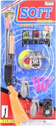 Plastová natahovacia puška, 4× šípka s prísavkou, 2× granát (cca 9 cm), vysielačka, putá, odznak, terčík (cca 13,5 × 8 cm)