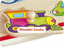 Každý dielik má drevený úchyt, vďaka ktorému deti dielik ľahko zdvihnú a presne vložia na svoje miesto – ideálne na tréning jemnej motoriky.