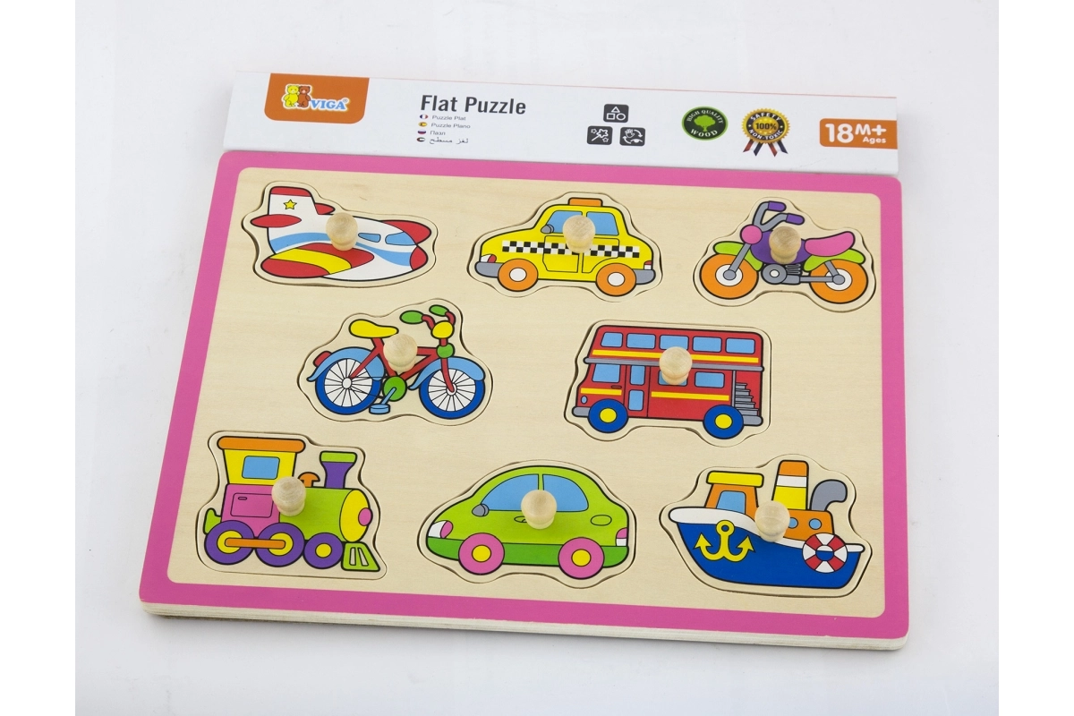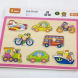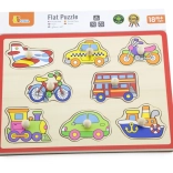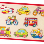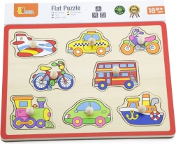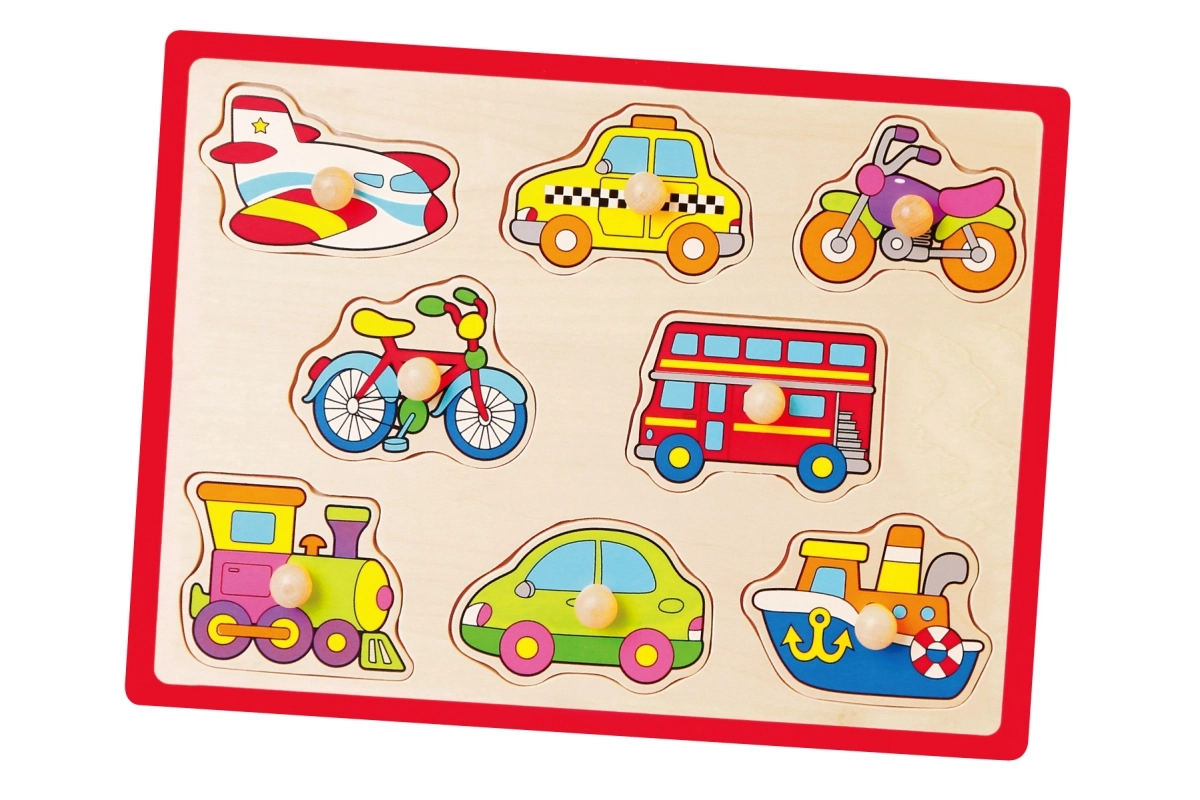 Táto kvalitná drevená vkladačka s motívmi vozidiel (lietadlo, taxík, bicykel, autobus a i.) ponúka zábavnú formu učenia. Dieliky s praktickými úchytmi zapadnú do vopred vyfrézovaných otvorov a deti si tak prirodzene trénujú zručnosť aj logické myslenie. Pevná drevená doska s rozmermi cca 30 × 22,5 cm je odolná a vhodná na každodenné hranie.