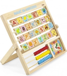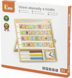 Drevená abeceda a hodiny v českom jazyku. Deti sa môžu naučiť písmená, čísla a získať všeobecnú predstavu o hodinách. Každé písmeno má na druhej strane slovo na lepšie zapamätanie. Rozmery cca 32,5 × 32 × 2,3 cm. Rozmery balenia cca 34 × 32,5 × 3 cm. Vek 3+