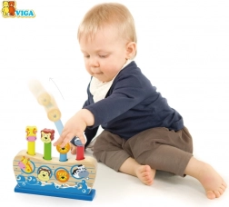 Stabilná drevená základňa v tvare lode a štyri drevené tyčky so zvieratkami (žirafa, opička, lev, zebra) vytvárajú bezpečné a odolné herné prostredie. Estetické balenie sa hodí ako ideálny darček pre predškolákov a batoľatá.
