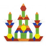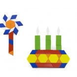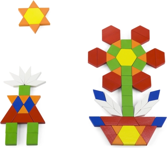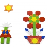 Veľký počet plochých drevených blokov v rôznych tvaroch a farbách podporuje fantáziu a rozvoj priestorovej predstavivosti. Deti môžu skladať vzory, zvieratá aj celé obrázky.