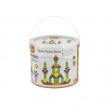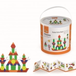 Bloky sú vyrobené z lakovaného dreva a farbené netoxickými farbami v živých odtieňoch. Praktické plastové veko s uchom uľahčuje prenášanie aj ukladanie. V balení nájdete tiež knížku s nápadmi, ktorá pomôže začiatočníkom aj malým tvorcom rozvíjať fantáziu.