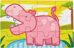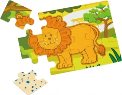 Jednoduché tvary a výrazné farby leva, slona, hrocha a opičky motivujú deti k skladaniu a podporujú vizuálne vnímanie.