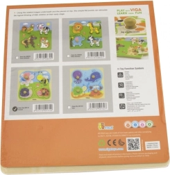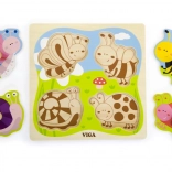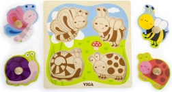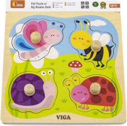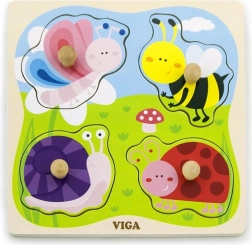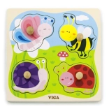 Drevená vkladačka VIGA so 4 veľkými dielikmi s úchytkami je ideálne prvé puzzle pre najmenších. Farebné motívy hmyzu a zvieratiek zo sveta lúky deti prirodzene motivujú k objavovaniu a učeniu. Vyfrézované okraje na pevnej drevenej podložke pomáhajú, aby každý dielik držal spoľahlivo na svojom mieste.
