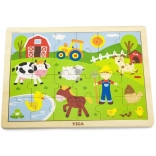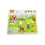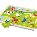 Drevené puzzle s farmárskym motívom zobrazuje rôzne aspekty farmárskeho života, vrátane zvierat a farmára, čo je atraktívne pre deti.