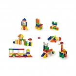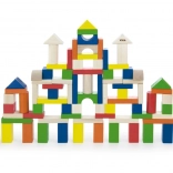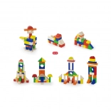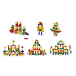 Drevená stavebnica vo vedierku. Obsahuje 100 dielikov a obrázkovú brožúru s návodmi na stavanie. Rozmery balenia cca 18 × 21 cm. Veľkosť kociek 2,5 – 7,5 cm podľa typu. Vek 2+