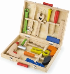 Praktická drevená sada náradia v pevnom kufríku pre malých majstrov od 3 rokov. Obsahuje 12 dielov (vŕtačka, kladivo, píla, kľúč, skrutkovač a pod.), ktoré rozvíjajú jemnú motoriku, kreativitu a hru na remeselníka. Kompaktné rozmery cca 31,5 × 24 × 6 cm, kovové pracky a červené madlo pre ľahké prenášanie.