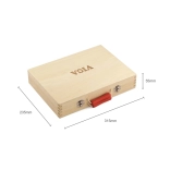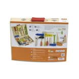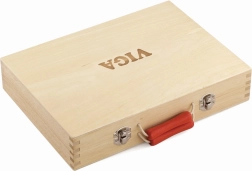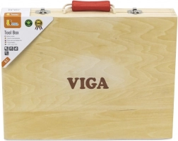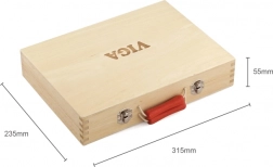Pevný drevený kufrík s kovovými prackami a červeným madlom udrží všetko na svojom mieste, takže sa žiadny kúsok nestratí. Vďaka prehľadnému usporiadaniu má každé náradie svoje miesto a celá sada je ľahko prenosná na návštevy, cesty aj do detskej izby.