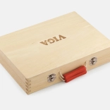 Odolný drevený kufrík s kovovými prackami a pohodlným červeným madlom udrží všetko bezpečne pokope – ideálny na cesty aj pre upratanú detskú izbu.
