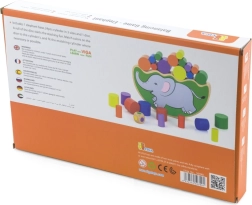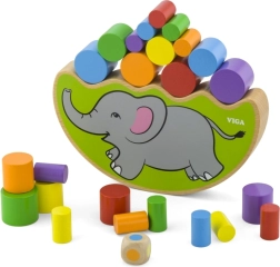 Zábavná drevená hra pre deti od 3 rokov, ktorá rozvíja jemnú motoriku, trpezlivosť a koordináciu oko–ruka. Hráči hádžu farebnou kockou a podľa padnutej farby odoberajú či ukladajú valček na sloniu základňu – bez prevrhnutia!