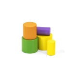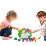 Klenutá slonia základňa a rôzne veľkosti valčekov učia deti citlivo vyvažovať a presne ukladať dieliky.