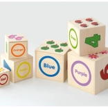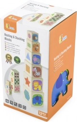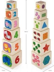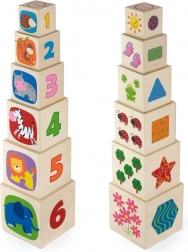 Sada obsahuje 6 pevných drevených kociek rôznych veľkostí, z ktorých deti postavia stabilnú vežu alebo ich môžu vkladať do seba. Bohaté ilustrácie so zvieratami, farbami, tvarmi a množstvom prvkov podporujú rané učenie a rozširujú slovnú zásobu.