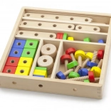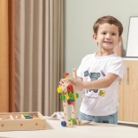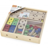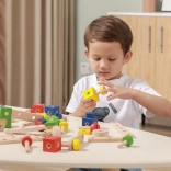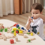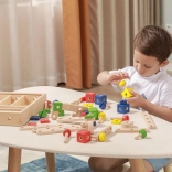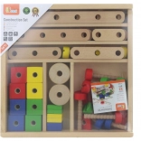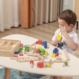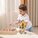 Stavebnica rozvíja jemnú motoriku, koordináciu oko–ruka a logické aj priestorové myslenie. Prírodné drevo v kombinácii s pestrými farbami láka k hre a učeniu formou zábavy. Všetko je prehľadne uložené v boxe s priehľadným vekom, aby sa dieliky ľahko upratovali a boli vždy po ruke.