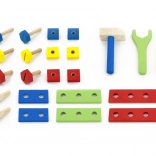 Súčasťou sady je skrutkovač, kladivko, kľúč, skrutky, matice a doštičky – ideálne na napodobňovanie opráv a stavania.