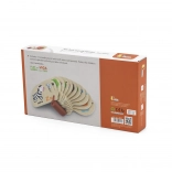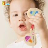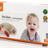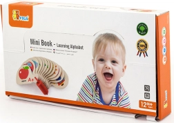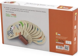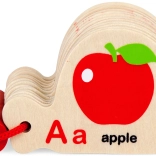 Sada drevených kariet spojených červenou šnúrkou obsahuje rôzne obrázky, písmená a názvy prvkov v angličtine na každej karte. Táto hračka učí deti písmenká, rozvíja motorické zručnosti a ponúka prvé slová v angličtine.