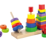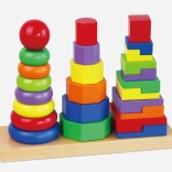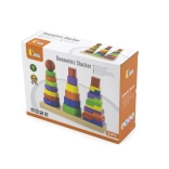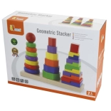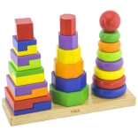 Drevená skladačka pyramída je ideálnou hračkou pre deti od 2 rokov, ktorá podporuje rozvoj motoriky a rozpoznávanie tvarov vďaka farebným geometrickým dielom.
