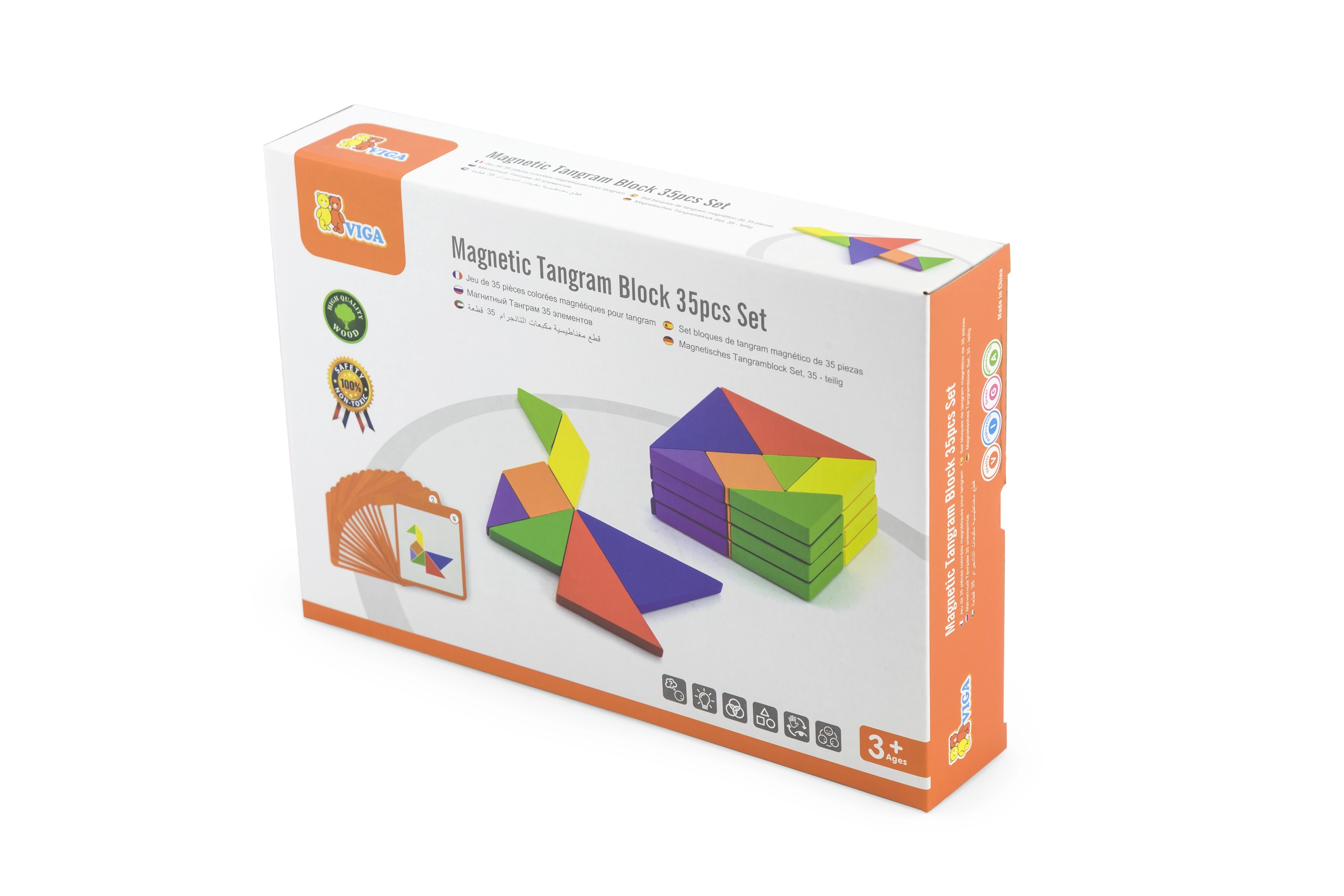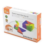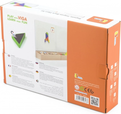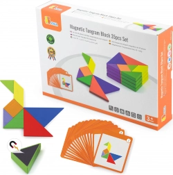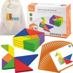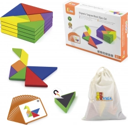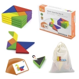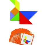 Tento farebný drevený tangram je ideálnou pomôckou na domáce hranie aj predškolské vzdelávanie. Deti skladajú obrázky podľa priložených kartičiek alebo podľa vlastnej fantázie, čím rozvíjajú priestorovú predstavivosť, tvorivosť a schopnosť riešiť problémy. Hladko opracované dieliky z masívneho dreva sú príjemné do ruky a odolné na každodenné používanie.