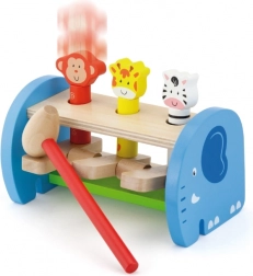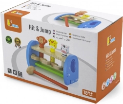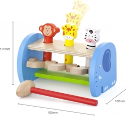 Táto kvalitná drevená hračka ponúka bezpečné a farebné hranie s roztomilými zvieratkami. Deti pomocou kladivka poklepávajú na mechanizmus, ktorý nechá zvieratká vyskočiť – zdokonaľujú tak úchop, silu stisku aj presnosť pohybu. Pevná konštrukcia a hladké hrany zaisťujú bezpečie pri každodennom používaní.