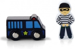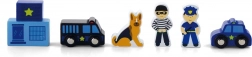 Vaše deti môžu vytvárať vlastné príbehy a scenáre s týmito farebnými postavami, ktoré vystihujú autentickú atmosféru policajnej scény: od policajta až po zlodeja a policajného psa. Všetky postavy sú vyrobené z kvalitného dreva, čo zaručuje ich odolnosť a dlhú životnosť.