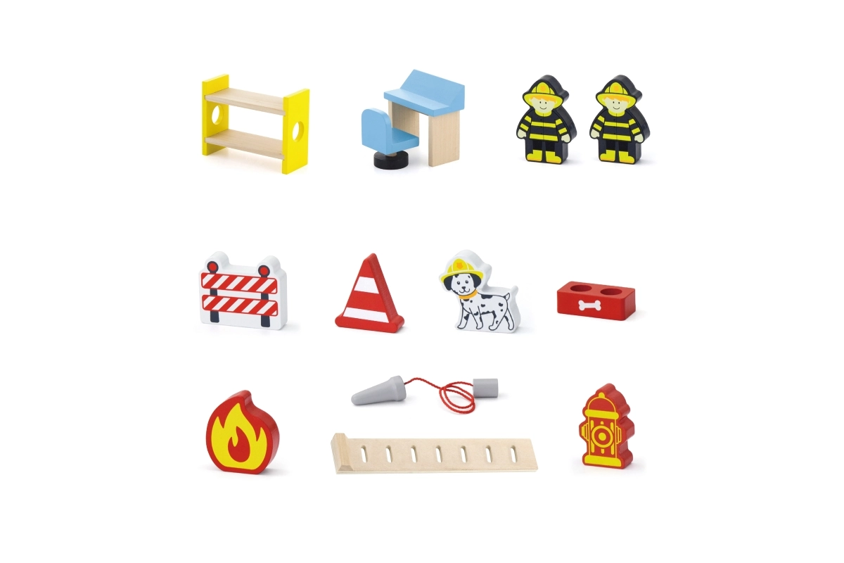 V balení nájdete všetko pre okamžité hranie: budovu stanice, 2 hasičov, vrtuľník, hasičské auto, hydrant, poschodovú posteľ, stoličku, ovládací panel a rebrík. Materiály a farby sú bezpečné a netoxické, aby sa deti mohli hrať bez starostí. Ideálne ako darček, ktorý poteší a zároveň vydrží.