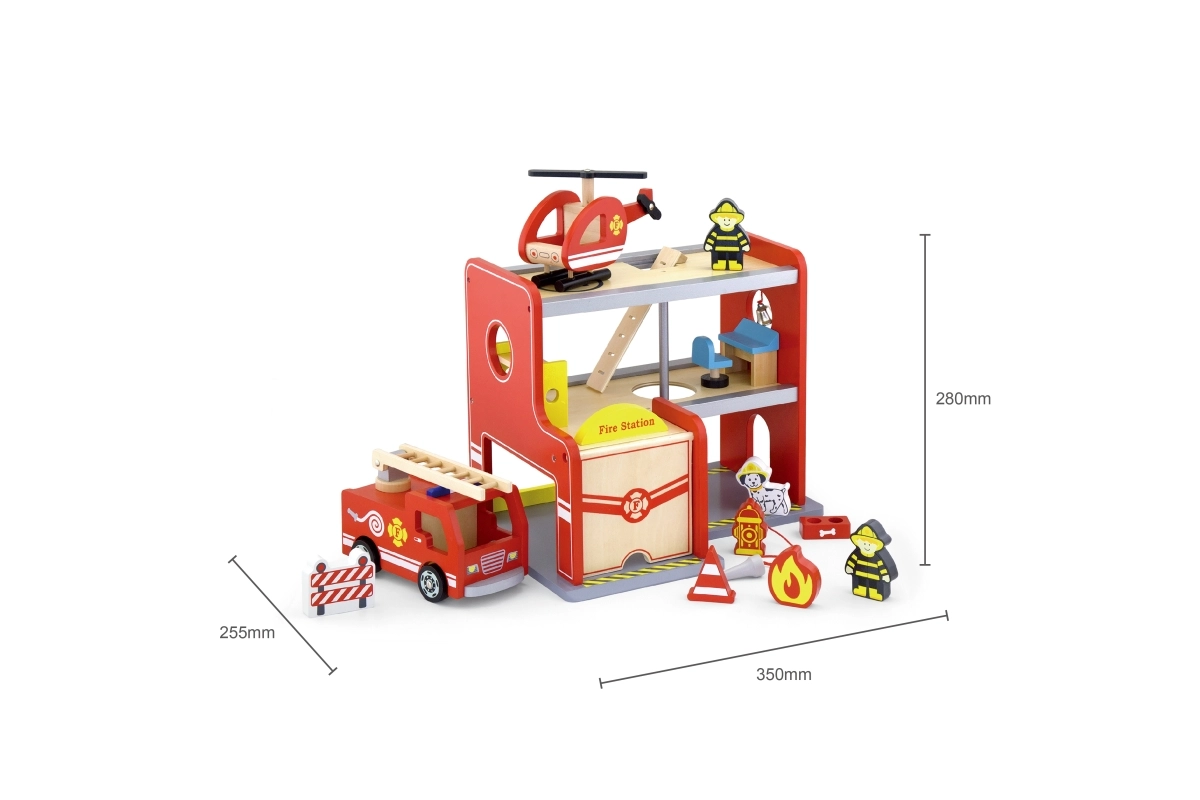 Drevená hasičská stanica Viga je kompletný herný set s viacerými poschodiami, ktorý podporuje rolové hranie, rozvoj jemnej motoriky a predstavivosti. Deti môžu vychádzať z garáže s autom, pristávať s vrtuľníkom na hornej ploche a spustiť sa rúrou priamo k zásahu. Farebné detaily a kvalitná drevená konštrukcia zaisťujú atraktívny vzhľad aj odolnosť pri každodennom používaní.