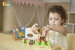 Objavte kvalitný drevený kubus, ktorý deti zabaví a zároveň ich rozvíja. Základňa a kolíky sú vyrobené z vysoko kvalitného masívneho bukového dreva, kocky sa na kolíky ľahko nasúvajú a vďaka ich nakláňaniu je otáčanie pri skladaní obrázkov plynulé a pohodlné.