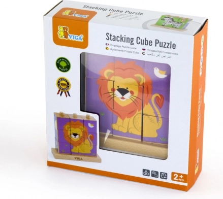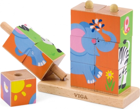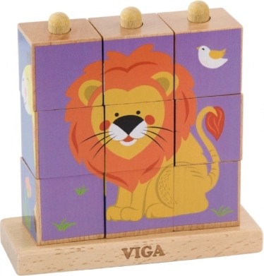 Drevené zasúvacie kocky Viga Safari sú nadčasovou hračkou, ktorá deti prirodzene vedie k učeniu formou hry. Deväť hladko opracovaných kociek na stabilnej základni umožňuje skladať štyri farebné motívy zvieratiek. Vďaka naklápacím kolíkom sa kocky ľahko otáčajú a deti rýchlejšie nájdu správny dielik.