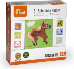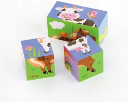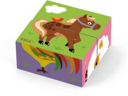 Detská drevená skladačka VIGA Farma prináša chytľavú hru s kockami, z ktorých deti poskladajú veselé obrázky zvieratiek z gazdovstva. Každá strana kocky tvorí iný obrázok, takže z iba 4 kociek vznikne až 6 rôznych ilustrácií. Hra je skvelá pre prvé logické úlohy a učenie formou hry.