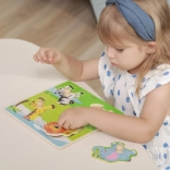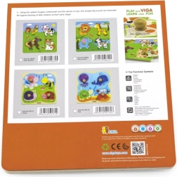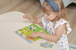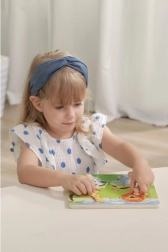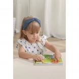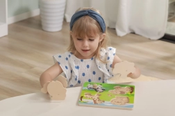 Stabilná drevená podložka s vyfrézovanými okrajmi zabezpečuje, že dieliky dobre držia, a zároveň podporuje vnímanie tvarov, trpezlivosť a logické myslenie. Vkladačka je ideálna pre prvé spoznávanie zvieratiek a rozvoj reči.