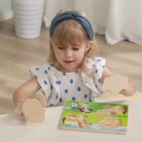 Pod každým dielikom je obrázok pre jednoduché priradenie. Deti si prirodzene precvičujú rozpoznávanie tvarov a zvieratiek.