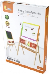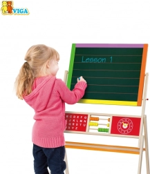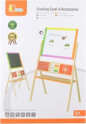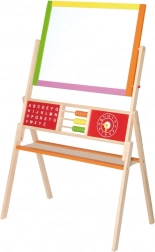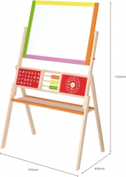 Táto univerzálna drevená tabuľa je ideálna pre deti od troch rokov vďaka svojim mnohým funkcionalitám. Ponúka magnetickú plochu vhodnú pre bez tlaku fixy a kriedovú plochu pre tradičné písanie a kreslenie. Tabuľa zahŕňa tiež zábavné a vzdelávacie prvky: