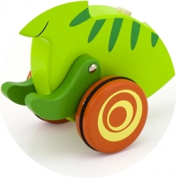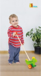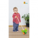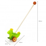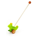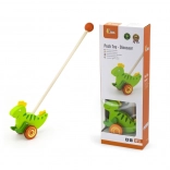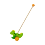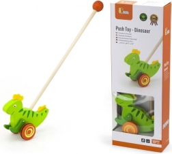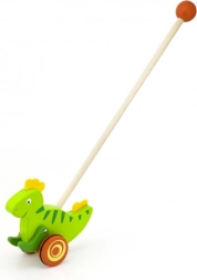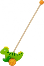 Drevená tlačiaca hračka Dinozaur je klasická hračka určená pre deti, ktoré sa začínajú pohybovať. Tento robustný doplnok je vybavený kolieskami s protišmykovými nástavcami, ktoré chránia podlahu a uľahčujú pohyb. Zelený dinosaurus energicky pohybuje rukami pri tlačení, čím zaujme a motivuje dieťa k ďalšiemu pohybu.