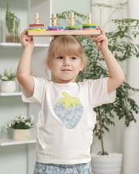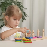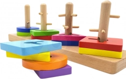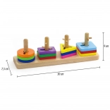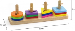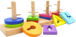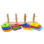 Vďaka skladaniu rôznych tvarov na drevené kolíky hračka podporuje rozvoj jemnej motoriky a koordinácie ruky a oka.
