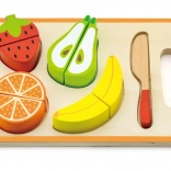 Táto kvalitná drevená sada ponúka bezpečnú hru na varenie: jednotlivé kúsky ovocia sú spojené suchým zipsom, vďaka čomu ich môžu deti opakovane „krájať“ a znova spájať. Vďaka realistickému prevedeniu sa deti učia rozpoznávať tvary a farby, precvičujú úchop a koordináciu a rozvíjajú fantáziu pri hre na kuchára.